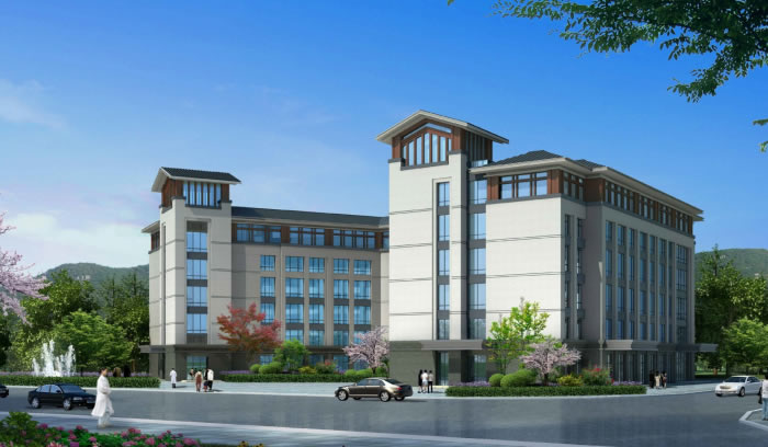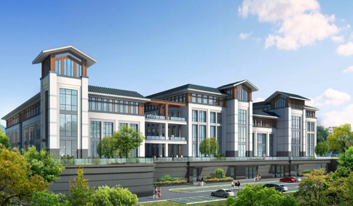 用現(xiàn)代的做法和材料來表現(xiàn),立面主要采用石材與真石漆,色彩上以深淺搭配為主,。灰色寓意根植于厚重的山脈之中,大面積的白色增加反射光線的明度,緩解就醫(yī)人員的壓抑感。位于頂層的搭梁棕褐色真石漆象征山中的林木,為整體正大嚴(yán)肅的建筑風(fēng)格增加了活力。